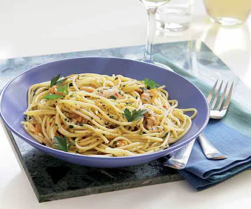 While the pasta is cooking, heat the remaining 3 Tbs. olive oil in a 10- or 12-inch skillet over medium heat. Add the remaining 3 Tbs. chopped parsley and the rest of the garlic and cook until the garlic is just soft, about 1 minute. Set the skillet aside.